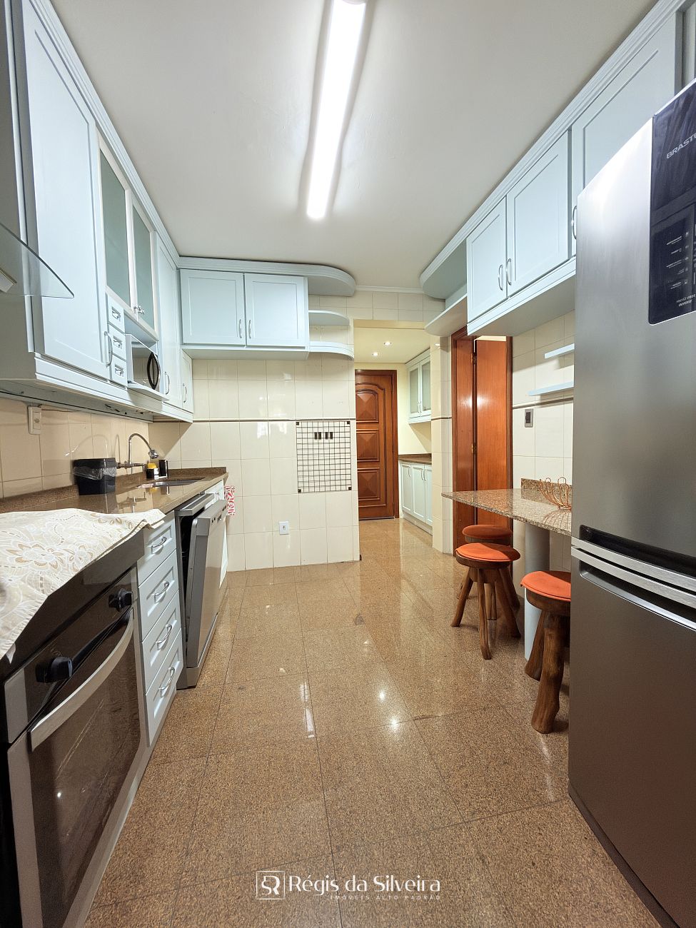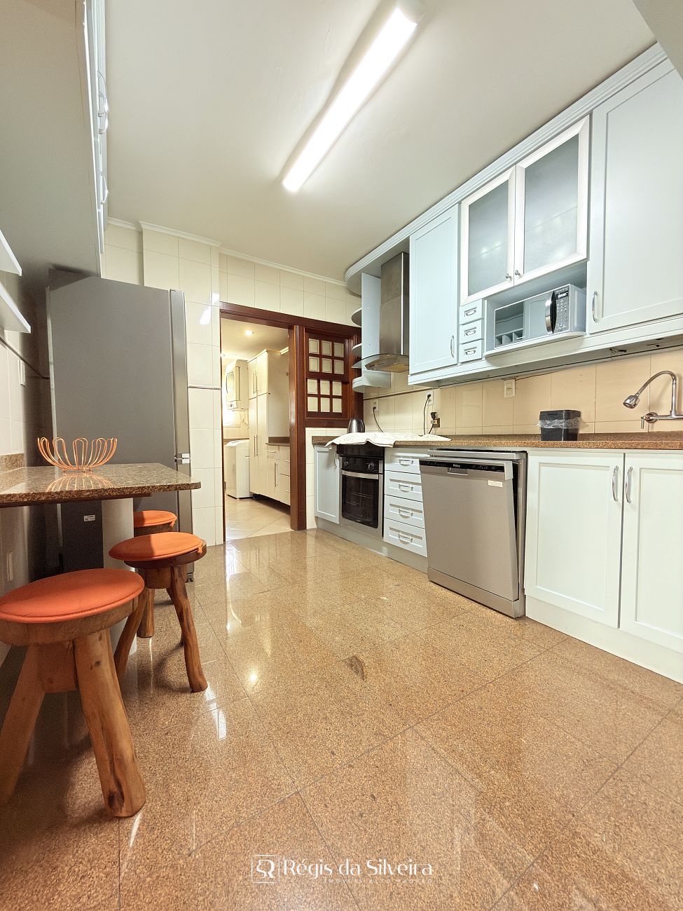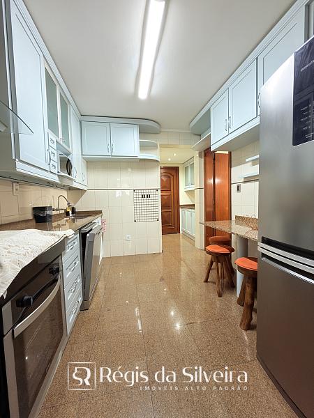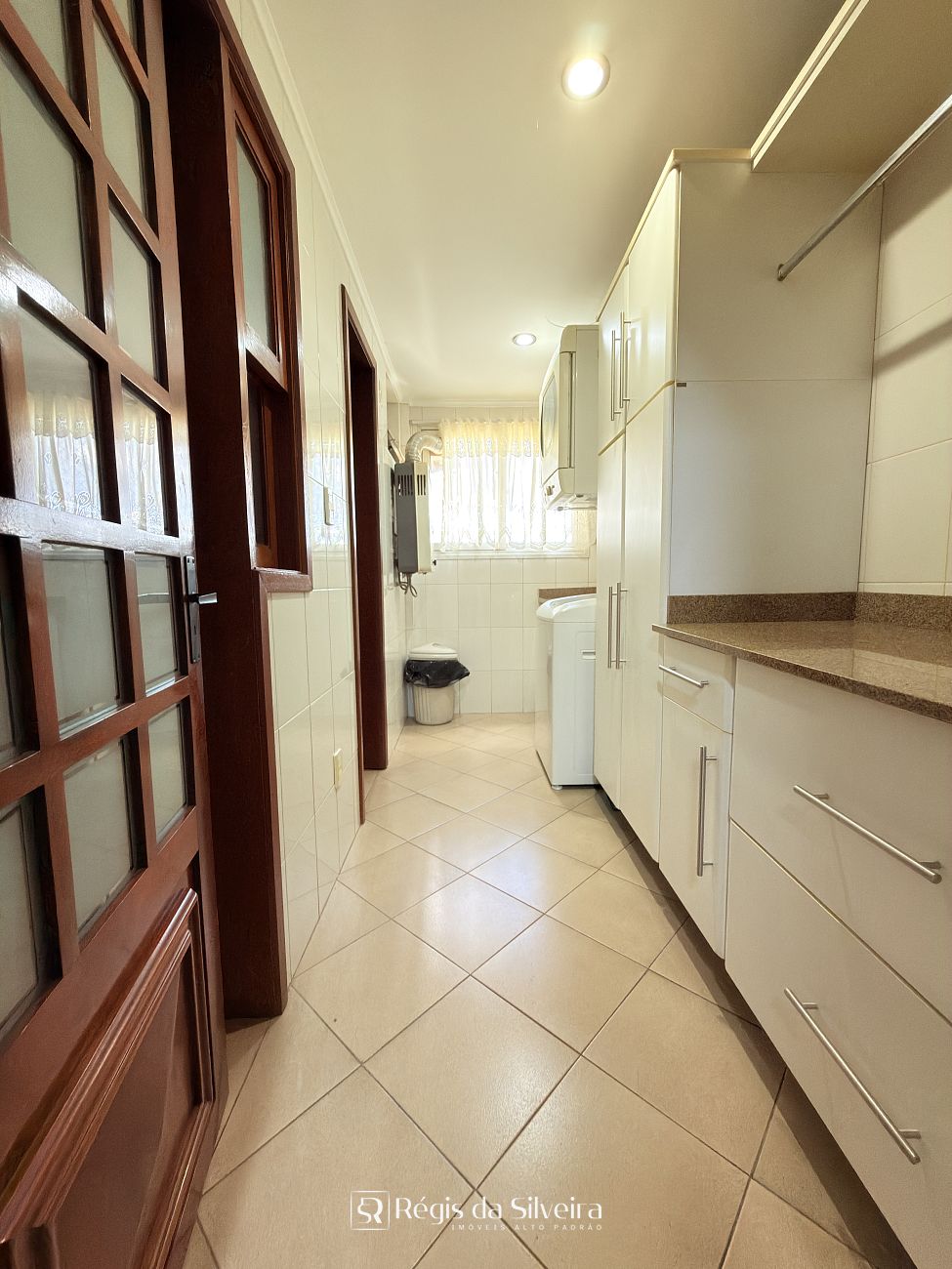 A cozinha é mobiliada, com bom aproveitamento de espaço, integrada a uma lavanderia ampla e separada, algo cada vez menos comum em apartamentos modernos, mas extremamente valorizado pela praticidade no dia a dia.